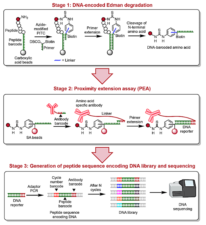 아지드기로 변형된 PITC 분자를 사용하여 변형된 에드만 분해 반응을 수행함으로써, DBCO로 변형되고 비오틴화된 프라이머와 클릭 커플링을 통해 결합하고, 이 프라이머는 펩타이드 바코드 서열에 직접 결합합니다.