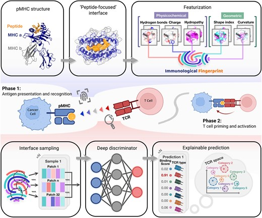 IMPRINT를 이용한 TCR-pMHC 인식의 표면 기반 판별 모델링. 해석 가능한 계면 지문 분석을 통해 TCR-pMHC 인식을 모델링하는 표면 기반 개념 프레임워크 개요. (중간) TCR-pMHC 인식의 개략도. TCR은 잠재적 결합 상호작용을 나타낼 수 있는 계면 특징인 면역학적 지문을 감지하여 pMHC 표면을 스캔하는 것으로 개념화됩니다. 그림은 BioRender.com으로 제작되었습니다. (상단) pMHC 계면에서 면역학적 지문을 추출하는 과정. 이 과정은 pMHC 구조를 직접 얻거나 TCR-pMHC 복합체에서 분리하는 것으로 시작됩니다. 다음으로, pMHC의 분자 표면을 계산하고 펩타이드에 인접한 영역을 계면으로 정의합니다. 마지막으로, 이러한 계면 영역 내의 표면 지점에 물리화학적 및 기하학적 특징을 보간합니다. (하단) 해석 가능성이 내장된 판별 모델에서 생성된 TCR 결합 선호도 예측. 지문 조각(‘패치’)을 무작위로 샘플링하여 심층 신경망에 입력함으로써 예측을 수행합니다. 개별 예측 결과와 해당 패치 간의 상관관계를 통해 성공적인 식별에 가장 크게 기여하는 중요 영역을 파악할 수 있습니다.
