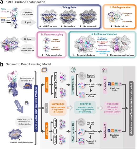 pMHC 인터페이스 모델링을 위한 기하학적 딥러닝 파이프라인. 확률적 패치 샘플링을 이용한 기하학적 딥러닝 기반 pMHC 표면 특징 추출 및 앙상블 모델링을 위한 기술 파이프라인을 나타낸 그림입니다. (a) TCR-pMHC 복합체에서 추출한 pMHC의 표면 특징 추출 파이프라인. 네 가지 주요 단계가 있습니다. (i) pMHC 표면을 이산 메쉬로 삼각분할합니다. (ii) 각 메쉬 정점 주변에서 측지 반경 r  = 12 Å인 방사형 패치를 추출합니다. (iii) 각 패치 내에서 두 개의 기하학적 특징과 세 개의 물리화학적 특징을 계산하고 표면 지점에 보간합니다. (iv) 측지 극좌표를 매핑하여 패치 내 특징의 상대적인 공간 위치를 나타냅니다. (b) 모델 아키텍처는 샘플링 기반 확률적 모델링 방식을 통해 해석 가능한 예측을 지원합니다. 각 pMHC에 대해, 임의의 펩타이드 원자로부터 4 Å 이내에 중심을 둔 표면 패치를 인터페이스 패치로 정의합니다(일반적으로 수백 개의 인터페이스 패치가 사용되며, 자세한 내용은 방법론을 참조하십시오 ). 이 중에서 32개의 패치가 무작위로 선택되어 TCR 결합 선호도를 예측하도록 훈련된 기하학적 심층 신경망에 입력됩니다. 견고성을 향상시키고 샘플링으로 인한 변동성을 고려하기 위해 각 pMHC 인터페이스는 100번 샘플링되어 32개의 패치와 이에 대응하는 100가지 조합이 생성됩니다. 최종 출력은 이러한 예측들을 평균 또는 다수결 투표를 통해 종합하여 도출됩니다.