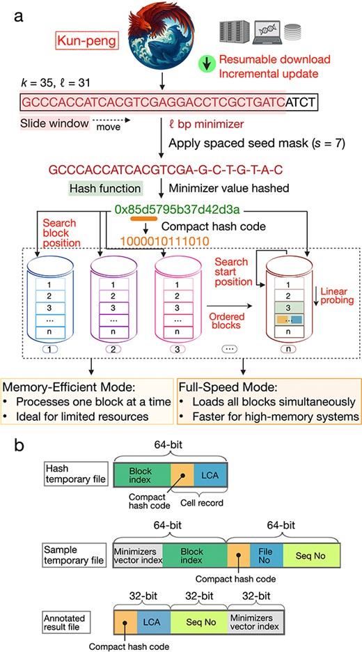 Kun-peng의 데이터 검색, minimizer생성 및 IBPDS 개요. (a) 데이터 수집부터 데이터베이스 검색까지의 Kun-peng 워크플로. 이 파이프라인은 게놈 데이터 검색을 위해 재시작 가능한 다운로드와 증분 업데이트를 지원합니다. 시퀀스 처리 과정에서 슬라이딩 윈도우를 사용하여 35bp  k -mer를 스캔하고 31bp 미니마이저(빨간색 상자)를 추출합니다. Kraken2와 달리 Kun-peng은 중복 계산 및 오탐을 줄이기 위해 고유한 ℓbp 미니마이저만 유지합니다. 미니마이저 시퀀스에 간격이 있는 시드 마스크( s  =7)를 적용한 후 해시 함수를 계산하여 압축된 해시 코드를 생성합니다. 이 해시 코드는 저장 블록과 데이터베이스의 순차 블록 내 검색 시작 위치를 결정합니다. 데이터베이스는 순차 블록(1~n)으로 나뉘어 블록 단위 로딩과 메모리 효율적인 쿼리가 가능합니다. 쿤펑은 제한된 연산 자원을 사용하는 환경을 위한 메모리 효율 모드(Kun-peng-M)와 최대 속도를 제공하도록 설계된 고속 모드(Kun-peng-F)를 제공합니다. 이 쿤펑 그림은 생성형 AI(ChatGPT-4o, OpenAI)를 이용하여 생성되었습니다. (b) 쿤펑의 세 가지 주요 파일 유형의 데이터 구조 설계: • 해시 임시 파일: 블록 인덱스, 압축 해시 코드 및 LCA 정보를 포함하는 64비트 구조; • 샘플 임시 파일: 최소화 벡터 인덱스, 블록 인덱스, 압축 해시 코드, 파일 번호 및 시퀀스 번호를 저장하는 64비트×2 구조; • 주석 결과 파일: 압축 해시 코드, LCA, 시퀀스 번호 및 최소화 벡터 인덱스로 구성된 32비트×3 구조.