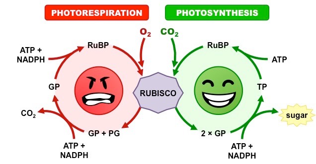 광합성에서 이산화탄소를 고정하는 루비스코(Rubisco) 효소는 가끔 산소를 잘못 잡아채는 실수를 저지르는데, 이로 인해 독성 부산물이 생성되고 이를 정화하는 과정에서 식물은 막대한 에너지를 낭비합니다.[6]