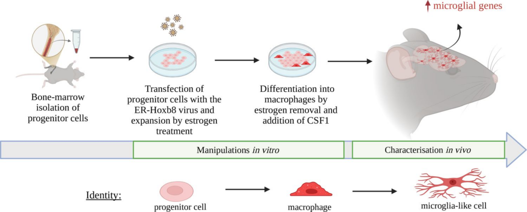 연구팀은 ‘Hoxb8’이라는 유전적 도구를 사용해 쥐의 골수 세포를 뇌 면역 세포와 거의 흡사한 형태로 분화시키는 데 성공했습니다.[12]